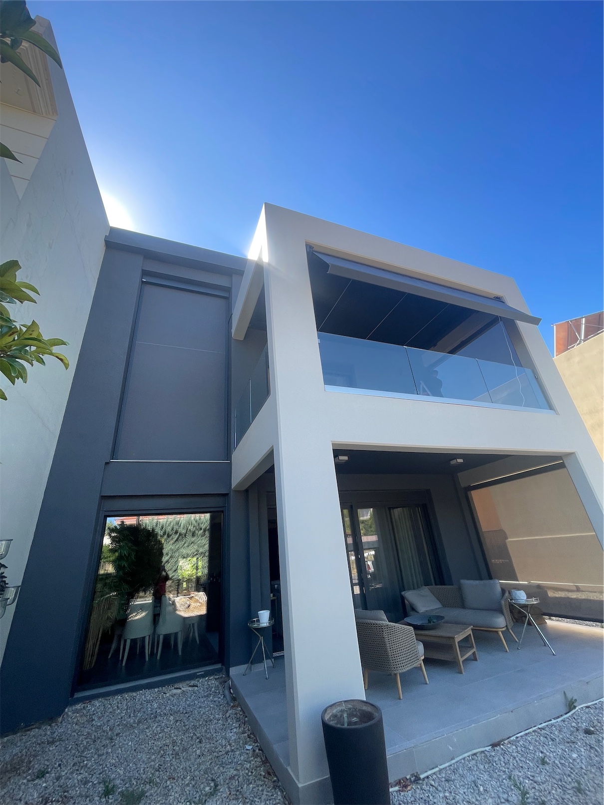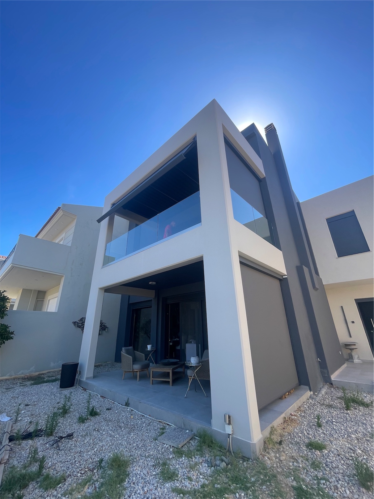 Τοποθετήθηκαν ηλεκτροκίνητα κάθετα συστήματα VERTITEX II της γερμανικής εταιρείας WEINOR, εξοπλισμένα με μοτέρ Somfy IO για απομακρυσμένο έλεγχο και απόλυτη ευχρηστία.