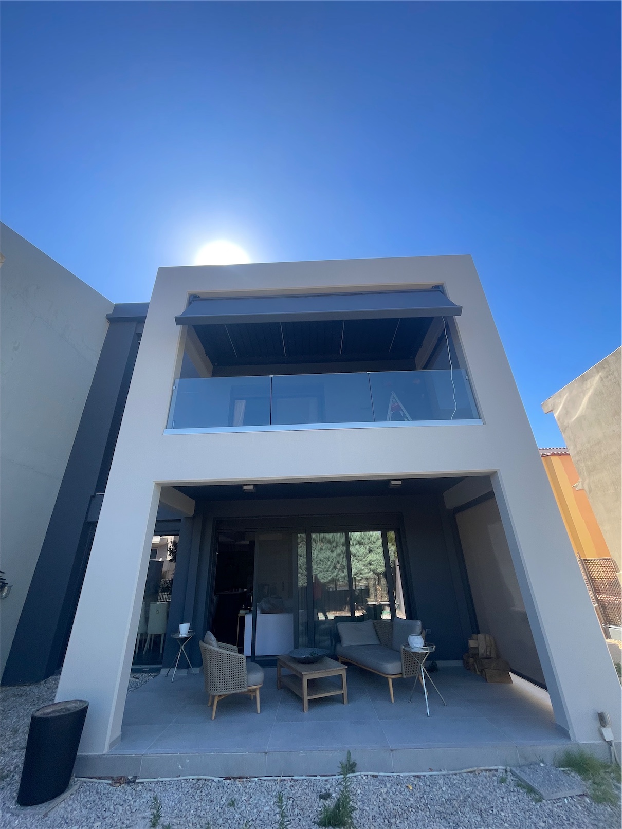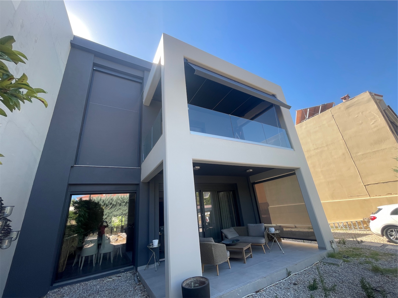 Στο έργο περιλαμβάνεται και η εγκατάσταση της κασέτας ALAND, μιας τέντας με μοντέρνο, τετράγωνο σχεδιασμό και αόρατες βίδες για απόλυτα καθαρές γραμμές.